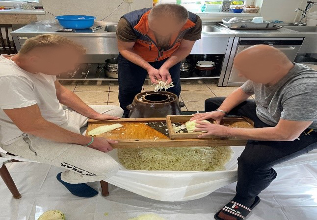 A nielen to, ale plníme postupne aj komôrku na zimu. Počas hubárskej sezóny klienti počas prechádzky v lese zbierali huby. Svojpomocne urobili lečo na zimu a pripravili sudovú kapustu podľa receptu zo Stupavy. Kapusta je výživná zelenina plná vitamínov, minerálov, vlákniny a antioxidantov. Podporuje zdravie srdca, trávenie, imunitný systém a má protizápalové účinky. Kapusta je všestranná v kuchyni a môže byť konzumovaná čerstvá, varená, nakladaná. Preto sa naši klienti rozhodli tento zázrak vitamínov si pripraviť na dlhé zimné obdobie.